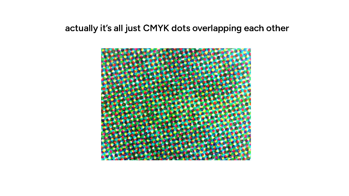 But upon closer look, it’s actually all four colors, overlapping in specific dot patterns. (this is also why resolution is often called DPI – dots per inch) (also why I’m somewhat peeved when people try to talk about DPI in a digital context. it wouldn’t be DPI then, it’d be PPI – pixels per inch)