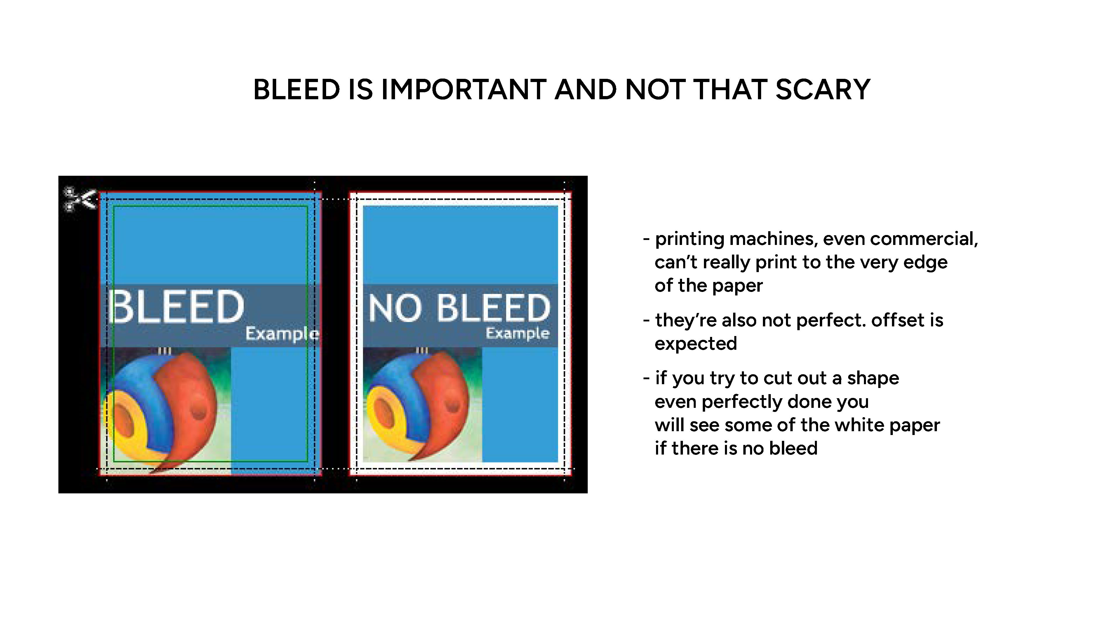 Okay, I’m kidding. Basically what it is is a safeguard. Unlike some home printers having “to the edge” printing, no commercially printed project is printed that way. Usually it is printed on bigger sheets which then get cut. Which is why having a bit of extra on the sides, aka a bleed, is crucial.