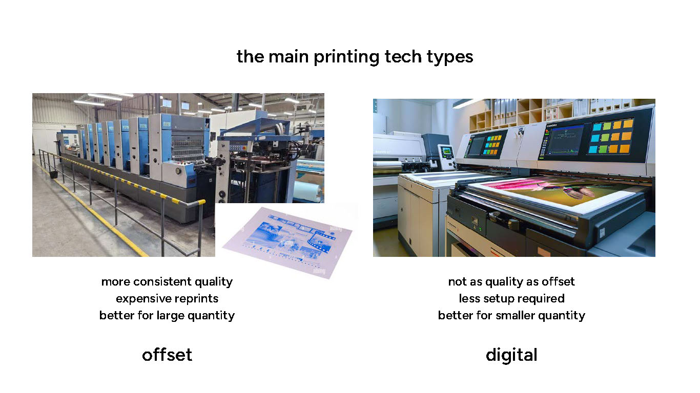 The main two are offset and digital! Offset is nicer and more reliable for huge quantities of prints, because your work literally gets put onto a huge metal plate and that is much more involved and analog than you think. (it’s like film photo development, if you know what that’s like!)